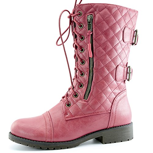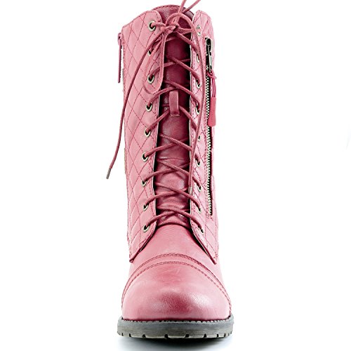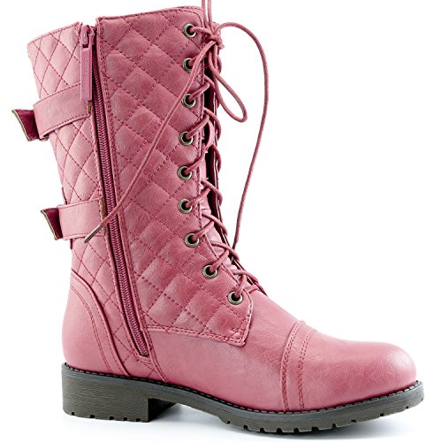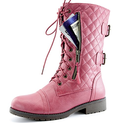 Women's Military Lace Up Buckle Combat Boots Mid Knee High Exclusive Quilted Credit Card Pocket, Hot Pink Pu, 8.5