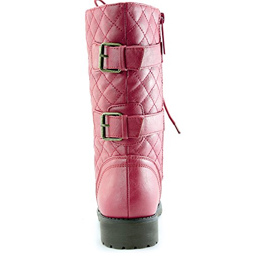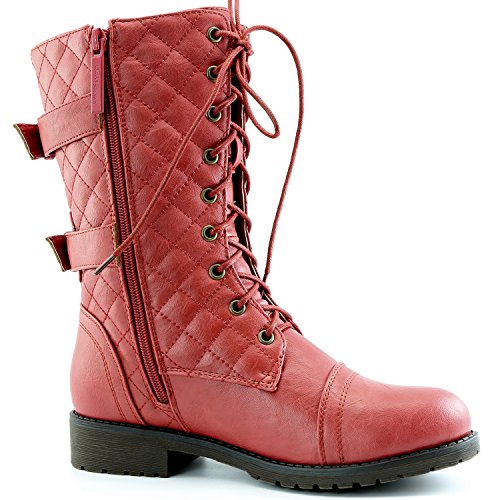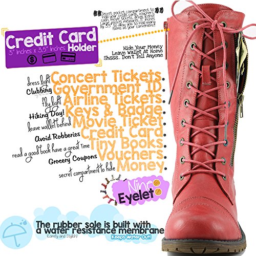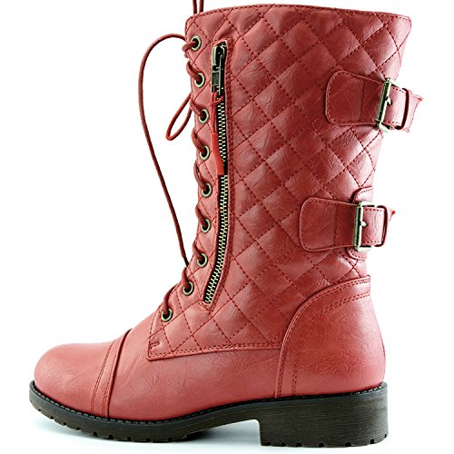 Women's Military Lace Up Buckle Combat Boots Mid Knee High Exclusive Quilted Credit Card Pocket, Red Pu, 9