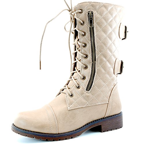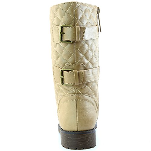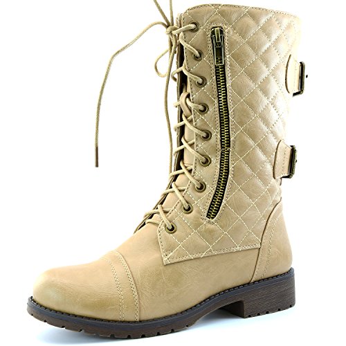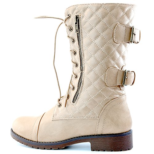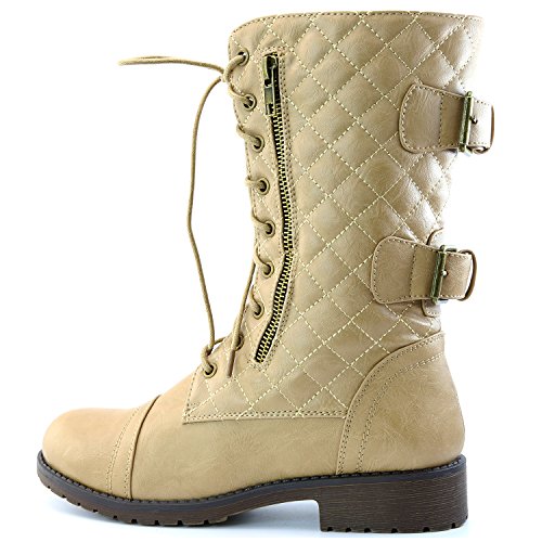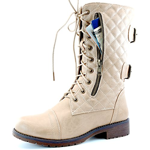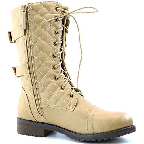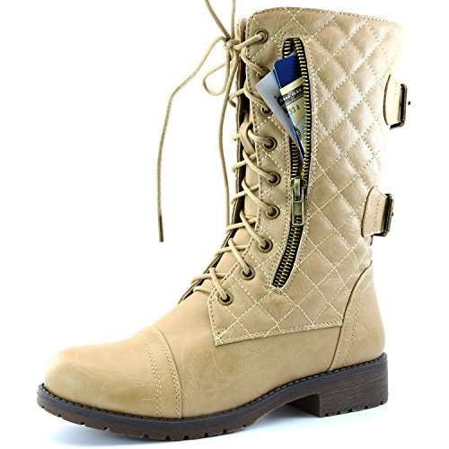 Women's Military Lace Up Buckle Combat Boots Mid Knee High Exclusive Quilted Credit Card Pocket, Beige Pu, 7