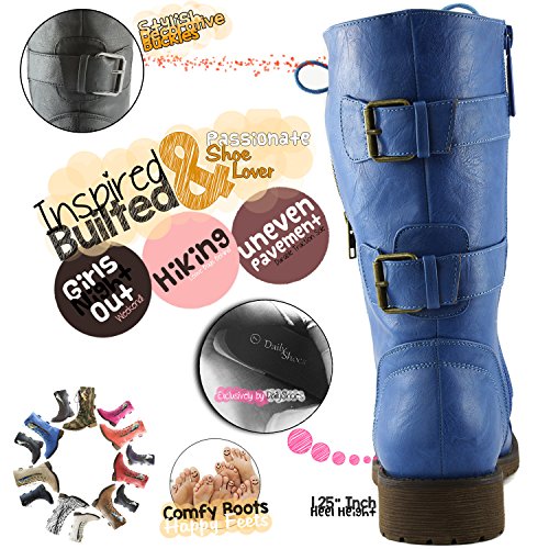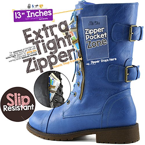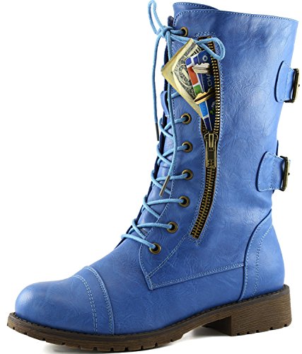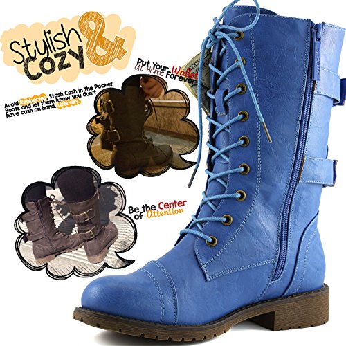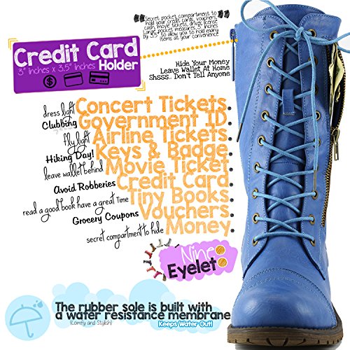 Women's Military Up Buckle Combat Boots Mid Knee High Exclusive Credit Card Pocket, Blue, 11
