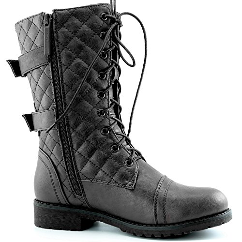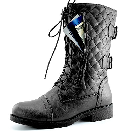 Women's Military Lace Up Buckle Combat Boots Mid Knee High Exclusive Quilted Credit Card Pocket, Black Pu, 8