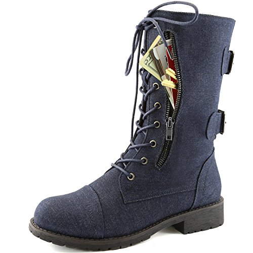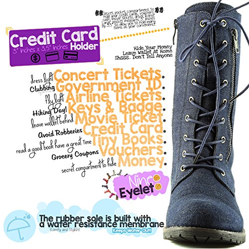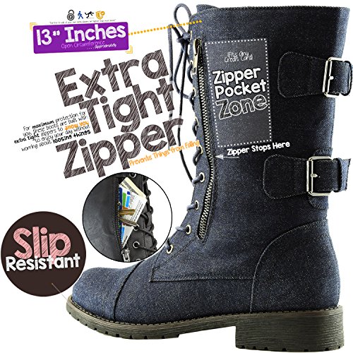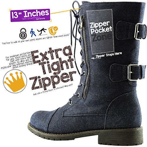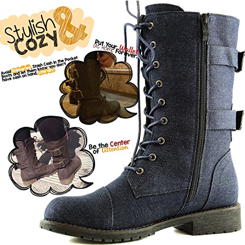 Women's Military Up Buckle Combat Boots Mid Knee High Exclusive Credit Card Pocket, Denim, 12