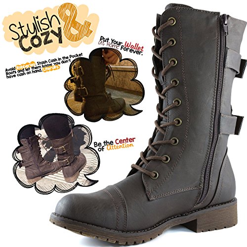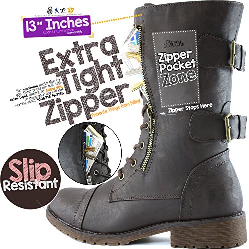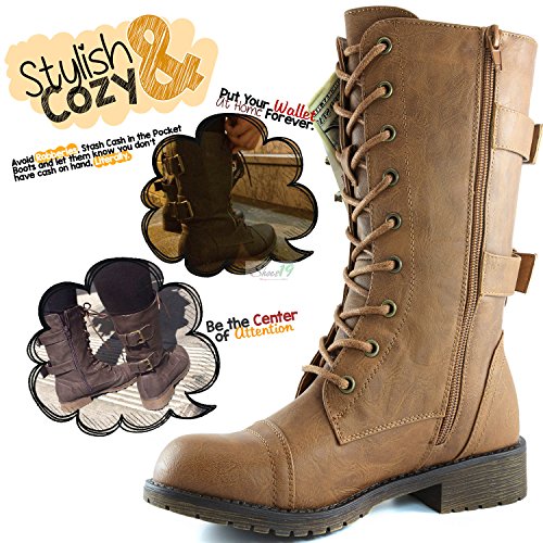 Women's Military Up Buckle Combat Boots Mid Knee High Exclusive Credit Card Pocket, Brown, 8.5