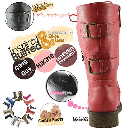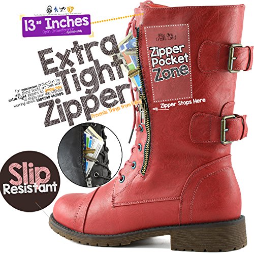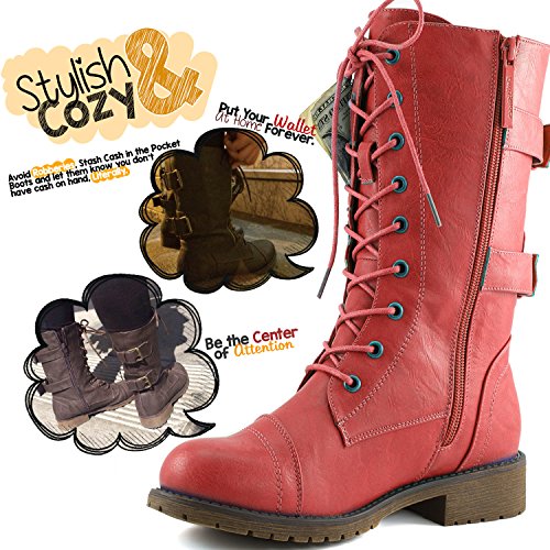 Women's Military Up Buckle Combat Boots Mid Knee High Exclusive Credit Card Pocket, Red, 8.5