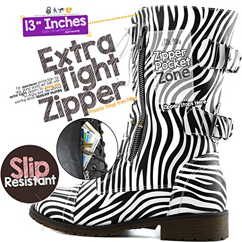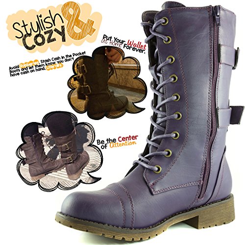 Women's Military Up Buckle Combat Boots Mid Knee High Exclusive Credit Card Money Pocket Pouch, 9