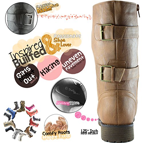 Women's Military Up Buckle Combat Boots Mid Knee High Exclusive Credit Card Pocket, Brown, 7.5