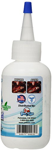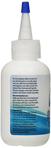 -. Binding : Misc. -. Brand : Pet Kiss -. EAN : 0184877000353 -. Feature : Cleans teeth freshens breath / Alcohol free / No brushing required / Vet Recommended -. Label : Pet Kiss Inc. -. Manufacturer : Pet Kiss Inc. -. Model : W-DG4B-5100 -. MPN : W-DG4B-5100 -. PackageQuantity : 1 -. PartNumber : W-DG4B-5100 -. ProductGroup : Pet Products -. ProductTypeName : PET_SUPPLIES -. Publisher : Pet Kiss Inc. -. Size : 4 oz -. Studio : Pet Kiss Inc. -. Title : Pet Kiss Brighter Bite Dental Gel for Pets, 4-Ounce -. UPC : 184877000353