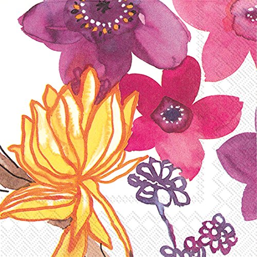 - Design features purple, pink and orange flowers in a painterly watercolor style on a white background