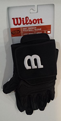 Studio : Wilson Publisher : Wilson Binding : Sports Product Description Wilson GST Trench Football Glove, Adult Medium, Black. GST Trench OL/DL Glove features a TackTech Trench Palm that provides the most advanced football glove technology specifically designed to grasp and tackle the opponent. Thermoform palm padding for increased protection. Flexible thumb-index finger construction increases hand flexation for maximum grip and durability. Fully adjustable wrist wrap with removable stability brace offers maximum wrist support to reduce hyperextension. Combination of strectch poly and padding on the backhand provide a flexible and breathable layer of targeted protection. The construction gives you a greater ability in grabbing the opponents while the ergonomic palm segmentation design allows for excellent fit and hand flexion. Back of the hand is a combination of breathable stretch poly and seamless thermoformed protective padding for low profile protection. NOCSAE approved. Product Details: Wilson. Adult Medium. GST Trench Football Glove. Wrist Brace. Black. Designed specifically for OL DL Players. 0