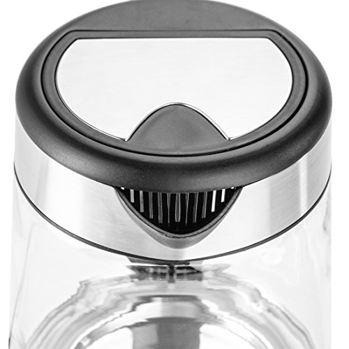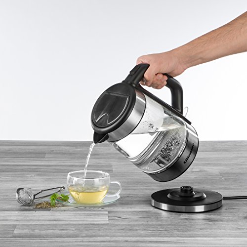 Moderner kabelloser 2.200 Watt Wasserkocher mit Edelstahl Sockel und praktischer 1.7 Liter Glas Fullbehalter aus hitzebestandigem Sicherheitsglas
