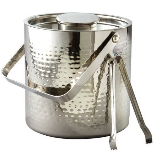 -. Feature : Crafted of quality stainless steel material / Hammered ice bucket with ice tong / Bucket has a 3 quart capacity / Swinging handle attached for easy carrying / Measures approximately: 7.25" Diameter x 7" High