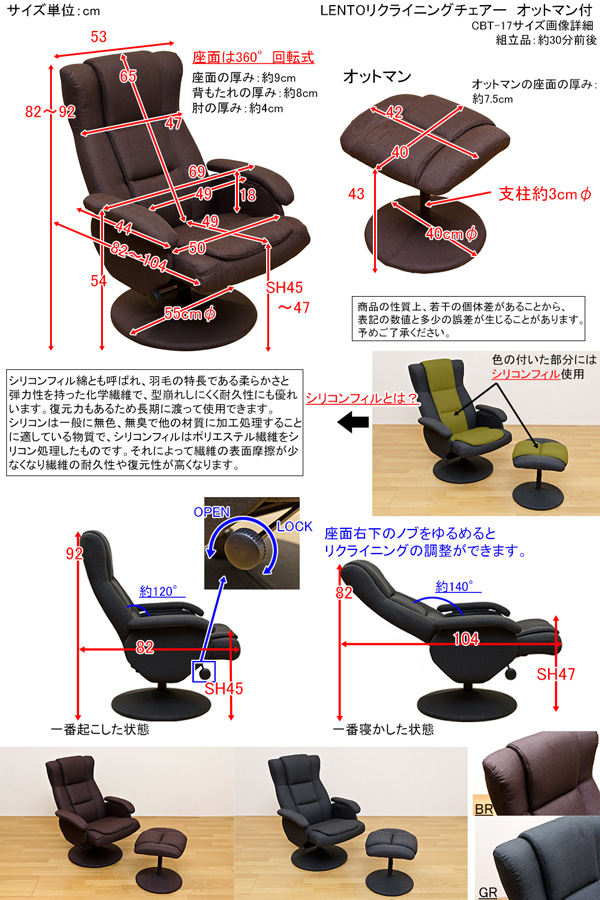 本商品はお取り寄せ商品のため、稀にご注文入れ違い等により欠品・遅延となる場合がございます。誠に恐れ入りますが、何卒ご了承ください。 また、以下の場合には追加送料がかかる場合がございます。  ・大型商品の複数購入時 ・同梱区分が異なる商品の複数購入時  【出荷目安】:1 - 4営業日 ※土日・祝除く 【同梱区分】:TS 1490 【梱包サイズ】:大型商品 【代引き決済】:不可  配送伝票の依頼主は出荷元(メーカーもしくは仕入元)名となる場合がございますので、お受け取りの際はご注意ください。   【型番】cbt17  【商品名の色やサイズについて】 こちらは「LENTO リクライニングチェア オットマン付 ブラウン (BR)」の商品ページです。商品画像や商品情報には、色違いやサイズ違いの商品が載っている場合がございます。ご注文前に色・サイズ・セット内容のご確認をお願いいたします。  ファブリックタイプのリクライニングチェアです。 ふっくらとしていて、包み込まれる質感が特徴のファブリック。 ゆったりとくつろぐことができます 360°回転チェアです 背もたれ・座面・オットマンの中央部分には、シリコンフィルを使用している為、長時間座っても疲れない座り心地を体感いただけます 【シリコンフィルとは・・・】 シリコンフィル綿とも呼ばれ、羽毛の特徴である柔らかさと弾力性を持った化学繊維で、型崩れしにくく耐久性にも優れています。復元力もある為長期に渡って使用できます。 シリコンは、一般に無色、無臭で他の材質に加工処理することに適している物質で、シリコンフィルはポリエステル繊維をシリコン処理したものです。 それによって繊維の表面摩擦が少なくなり繊維の耐久性や復元性が高くなります。 〔無段階リクライニング〕 椅子に座った状態で体を後ろに反らすと背もたれが後ろに倒れ、座面が前にスライドします お好みの位置で右肘下にある調整ノブを締めて固定します 最大約140度までリクライニング可能です ブラウン・グレーの2色展開です  チェア:幅690×奥行820~1040×高さ820~920mm オットマン:幅420×奥行400×高さ430mm (梱包サイズ:幅790×奥行320×高さ580mm[チェアとオットマン 同梱]) 座面高:450~470mm 座面サイズ:幅500×奥行490mm 座面厚み:約90mm 背もたれの厚み:約80mm 肘の厚み:約40mm 本体重量:チェア14.2kg/オットマン3.3kg(梱包重量:20.5kg) 組立式(約30分前後/付属の六角レンチにて組立)1梱包 ※商品の性質上、若干の個体差があることから、表記の数値と多少の誤差が生じることがあります。予めご了承ください。 張り材:ファブリック 内材:ウレタンフォーム、[座面、背もたれ、オットマンにシリコンフィル使用] フレーム:スチール  【ご注意事項】 ※本商品は、北海道・沖縄・離島への配送はいたしかねます。あらかじめご了承ください。