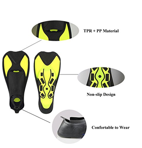 -. Feature : Material: TPR (soft area) +PP (hard area) / Color: 3 colors for choose: Rose red, yellow and blue. / Size: 6 sizes for both children and adults: XXS (34-35)/US 1-2, XS (36-37)/US 3-4, S (38-39)/US 5-6, M (40-41)/US 7-8, L (42-43)/US 9-10, XL (44-45)/US 10.5-11.5. (Note: In order to get the suitable fins, please know your feet length and compare with the size chart supplied. Manual measurement, please allow 1cm error.) / Features: Featured material, exquisite workmanship, non-slip design, unique drainage hole design, perfect appearance, classic color match, lightweight, easy to carry, flexible and comfortable to wear. / Suitable for both children and adult for swimming, training, diving on the swimming pool, beach, etc. It could be a gift for your kids, family, and friends or for yourself.