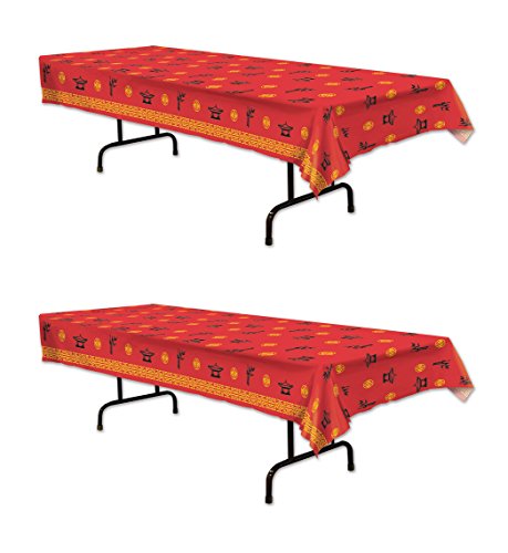 Product Description Beistle 59966 Asian tablecover. The package contains 2 rectangular Tablecovers. These Tablecovers are Red and printed with Yellow and black colors. Each tablecover measures 54 inches long by 108 inches wide. They are made of plastic. Use these Tablecovers for an Asian themed party or for Chinese new year! 0