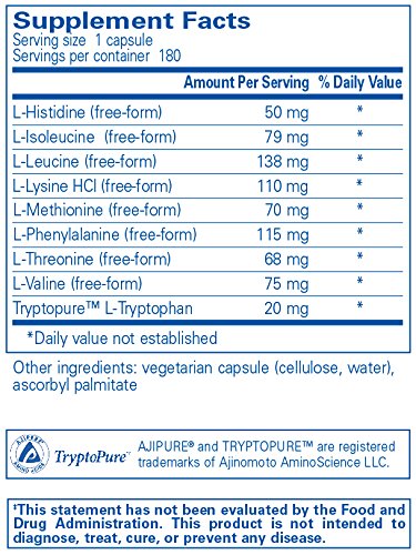 -. Binding : Health and Beauty -. Label : Pure Encapsulations -. Manufacturer : Pure Encapsulations -. ProductGroup : Health and Beauty -. ProductTypeName : HEALTH_PERSONAL_CARE -. Publisher : Pure Encapsulations -. Studio : Pure Encapsulations -. Title : Essential Aminos 180 VegiCaps