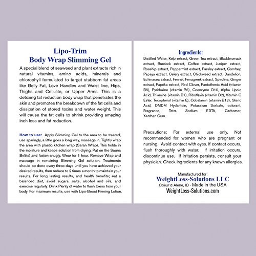 Lipo-Trim Body Wrap Slimming Gel is a Spa Strength blend of Seaweed, Plant Extracts and Herbs; rich in natural vitamins, amino acids, minerals and Chlorophyll that work together to penetrate deep through the skin and surface fat to stimulate blood circulation, and promotes the breakdown of the fat cells and dissipation of stored toxins and water weight. This will cause the fat cells to shrink providing inch loss, Belly fat reduction, and a slimmer, more contoured waistline. Treatments should be done daily for the first three days, then every third day until you have achieved your desired results. Almost everyone needs to Lose Belly Fat, Love Handles, and Muffin top, and it is the hardest and most stubborn fat to lose. Lipo-Trim will help you Get rid of Belly Fat Fast and get a slimmer waistline. Lipo-Trim can also be used for Hips, Buttocks, Thighs, Cellulite and to Firm and Tighten Upper Arms. Lipo-Trim is a must addition to your weight loss or weight management program to help you slim down, look good and feel great. Directions Apply Slimming Gel, use sparingly, a little goes a long way, massage in. Tightly wrap the area with plastic kitchen wrap (Saran Wrap). This holds in the moisture and keeps solution from drying. Put on the Sauna Belt(s) and fasten snugly. Wear for 1 hour. Remove Wrap, massage in, then clean with warm washcloth. Treatments should be done daily for the first 3 days, then reduce to every third das until you have achieved your desired results. Use as needed to maintain your results. For long lasting results, and health benefits; eat a balanced diet, avoid sugars, salts, alcohol and oils, and exercise regularly. Drink Plenty of water to flush toxins from your body. For maximum results, use with Lipo-Boost Firming Lotion.Feature