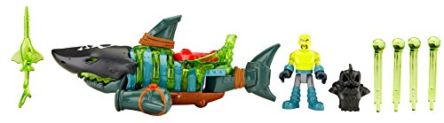 - Feature : Turn disk to activate mouth-chomping action and light up the 2 LEDS! / Push button to fire projectiles from the 2 launchers! / Includes the Imaginext Shark Boat, pirate figure with removable helmet, swordfish weapon and 4 projectiles / Bring them to Imaginext Ghost Pirate Island for even more swashbuckling adventures! (Sold separately and subject to availability) / Great addition to any Imaginext collection!