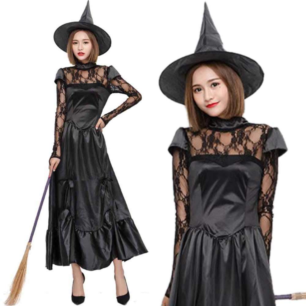 デコルテ部分と袖はレース素材で透け感があり、ちょっぴりセクシーで可愛らしいデザインの魔女コスチュームです。