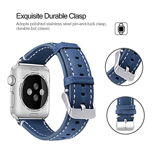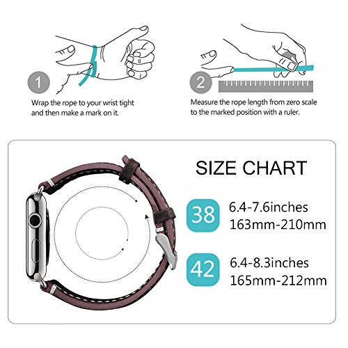 -. Feature : Applicable Type and Size: This genuine leather replacement wristband is fit for Apple Watch +, Series 2, Series 1, Series 3, Sport Edition. It has 2 versions, 38mm and 42 mm. Make sure you choose the right version. And band for 38mm watch is shorter than 42mm's. Band for 38mm watch fits 6.4-8.2 inches (163mm-210mm) wrist. Band for 42mm watch fits 6.4-8.3 inches (165mm-212mm) wrist. / Superior Quality and Good Craftsmanship: This replacement band is made of 100% genuine cowhide leather.It's a good combination of modern craftsmanship and retro style, which give your watch an elegant and fancy look.The interior of the band is surP.R.Isingly breathable, which helps keep your wrists cool and minimize sweat. / Excellent Choice: This band definitely ease your concern that apple watch doesn't look formal when attending business meeting or other social gatherings. It makes your apple watch fit your business suit. / Discoloration Problem: There might be an area of discoloration where the buckle secures the watch, this is often the case with leather product. It is in no way visible when the watch is worn. / After-sales Service: 180 days warranty. Hassle-free customer service: if there are any quality problems, just contact us. We would refund you or sent you a brand new one with 180-day warranty.