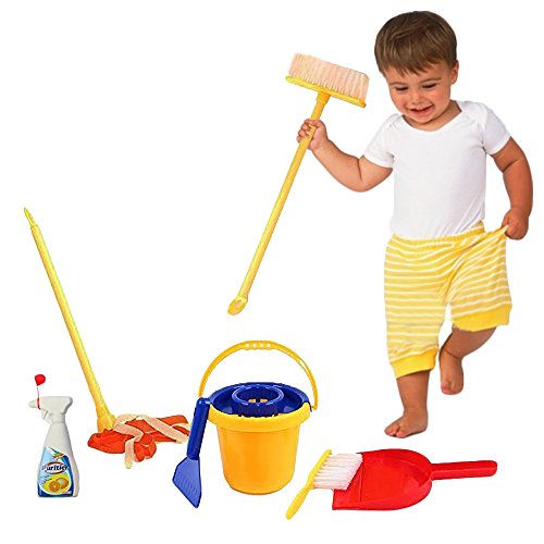-. Feature : 1 set Pretend and Play Mini Cleaning Set for Kids. / Toddler cleaning set contains mini broom, duster, mop, pale, dustpan and spray. / Home cleaning set are made from durable plastic and lightweight material. / Easy and fun to play, kids cleaning set comes in assorted color with hard-wearing plastic bag, portable and can be stored away for storage. / Kids cleaning play tools measures from 5 to 14 inches.
