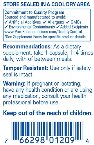FREE FROM: Pure Encapsulations products are free from wheat, gluten, egg, peanuts, magnesium stearate, hydrogenated fat, artificial sweeteners and colors, and other unnecessary excipients. Any product containing ingredients derived from allergens, such as soy, dairy or shellfish is clearly labeled. * These statements have not been evaluated by the Food and Drug Administration. This product is not intended to diagnose, treat, cure, or prevent any disease.