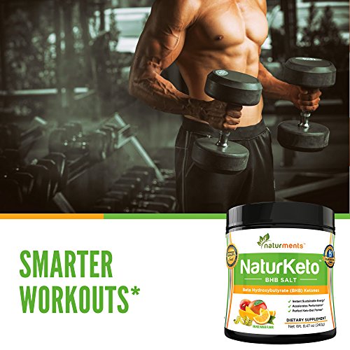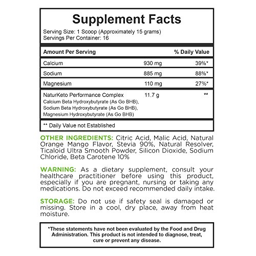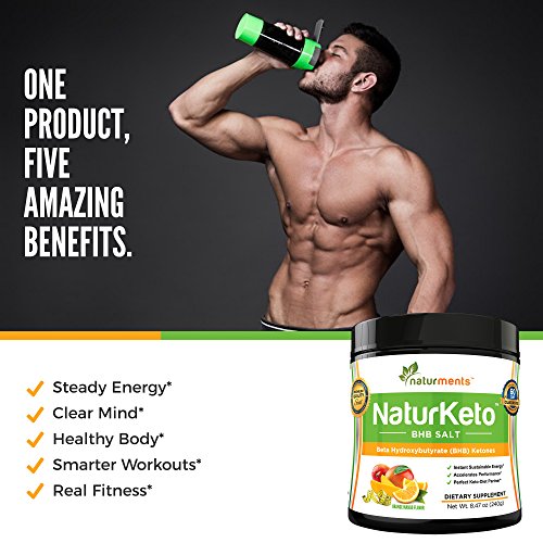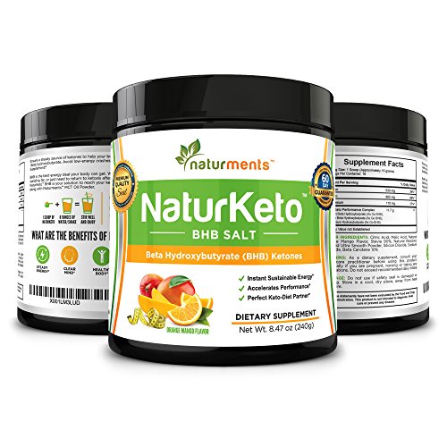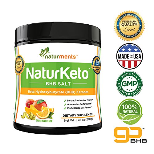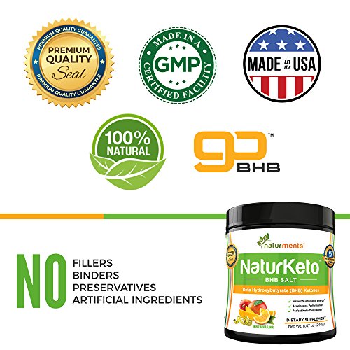 PREMIUM FAT BURNER Naturments BHB ketone dietary supplement salts are designed to help you burn belly fat and lose body weight faster by bringing your body to a state of ketosis. When combined with a regular exercise routine and a healthy diet, BHB salts can aid in improving overall weight loss. SPIKE PERFORMANCE LEVELS Whether you're look for a boost in mental or physical performance, exogeneous ketones can assist with improving brain functionality, cognitive abilities and focus, as well as athletic or fitness performance levels to keep you functioning at your peak and help you stay healthy. FRESH CITRUS TASTE Unlike other ketone supplements that leave a terrible taste in your mouth, our keto salt supplement will have you asking for more! We infused our product with an orange mango flavoring for an easy and tasty addition to your drink or meal that will make you crave this citrus flavor day after day. PURE FORMULA NaturKeto BHB does not contain carbs, sugar, caffeine, dairy, gluten, wheat, soy, eggs, fish, peanuts, shellfish or yeast. The blend is also Non-GMO, GMP certified, FDA registered and all natural without binders, fillers or preservatives. SUPPORTS NUTRITIONAL KETOSIS If you're searching for a high quality ketosis inducing product to boost your endurance, focus and energy levels then look no further than NaturKeto BHB. We stand behind the quality and ability of our products, but if you are not completely satisfied with your purchase, you may return your item within 60 days for your money back. - Ingredients: Calcium, Sodium and Magnesium Hydroxybutyrate, Citric Acid, Malic Acid, Natural Orange Mango Flavor, Stevia, Natural Resolver, Ticaloid Ultra Smooth Powder, Silicon Dioxide, Sodium Chloride and Beta Carotene - 240 Gram / 8.47 Ounce - Good Manufacturing Practice Certified and FDA Registered - Made in the USA - 60 Day Satisfaction GuaranteeFeature