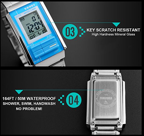 -. Title : Mens Unique Stainless Steel Rectangle Digital Electronic LED Waterproof Casual Sport Dress Watch Adjustable Band, Stop Watch, Back Light, Calendar Date Day, Alarm, 164FT 50M Water Resistant - Blue