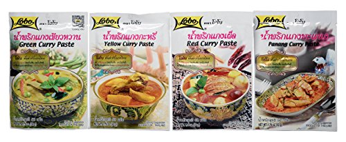 Curry Paste Sampler 4-Pack: Penang Curry Paste, Red Curry Paste, Yellow Curry Paste, Green Curry Paste. All The Most Popular Thai Curry Pastes for You to Savour.