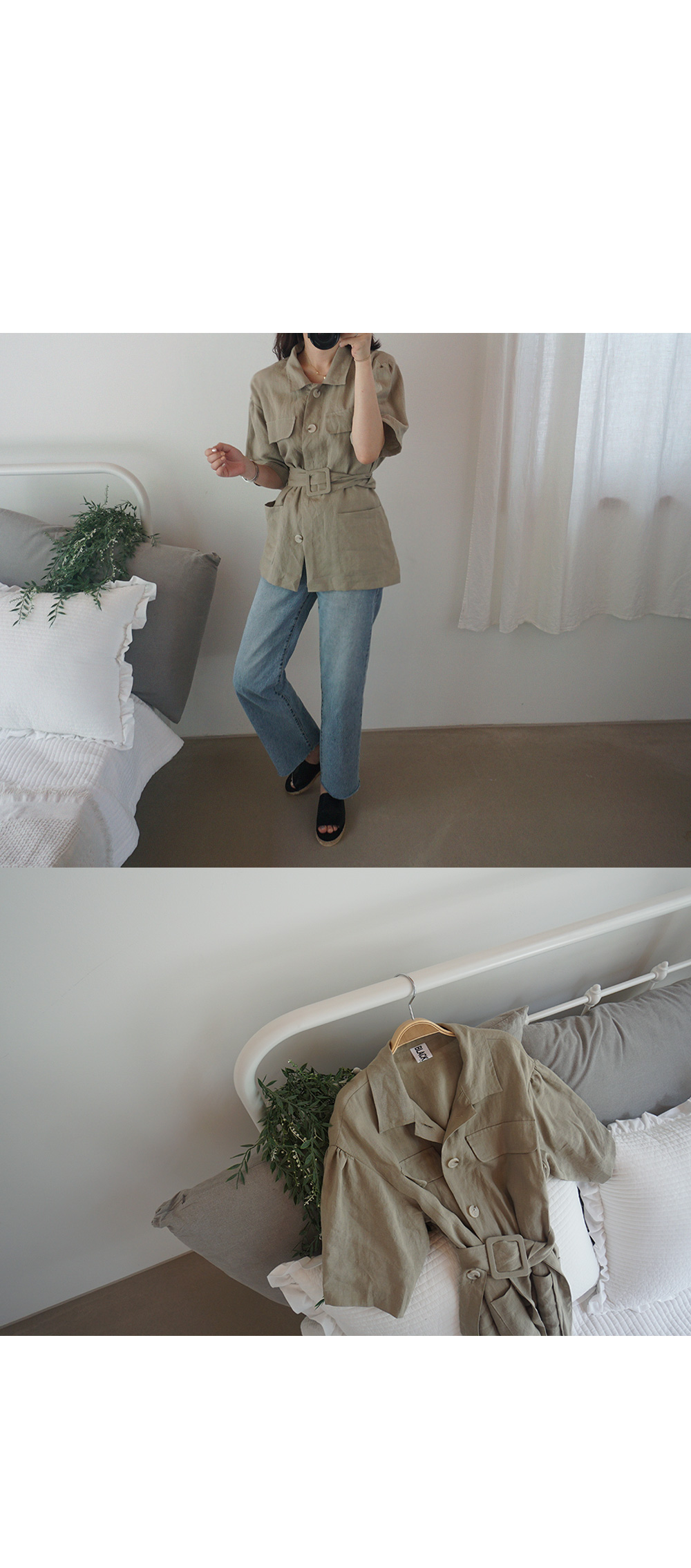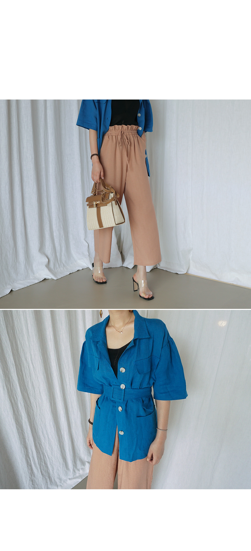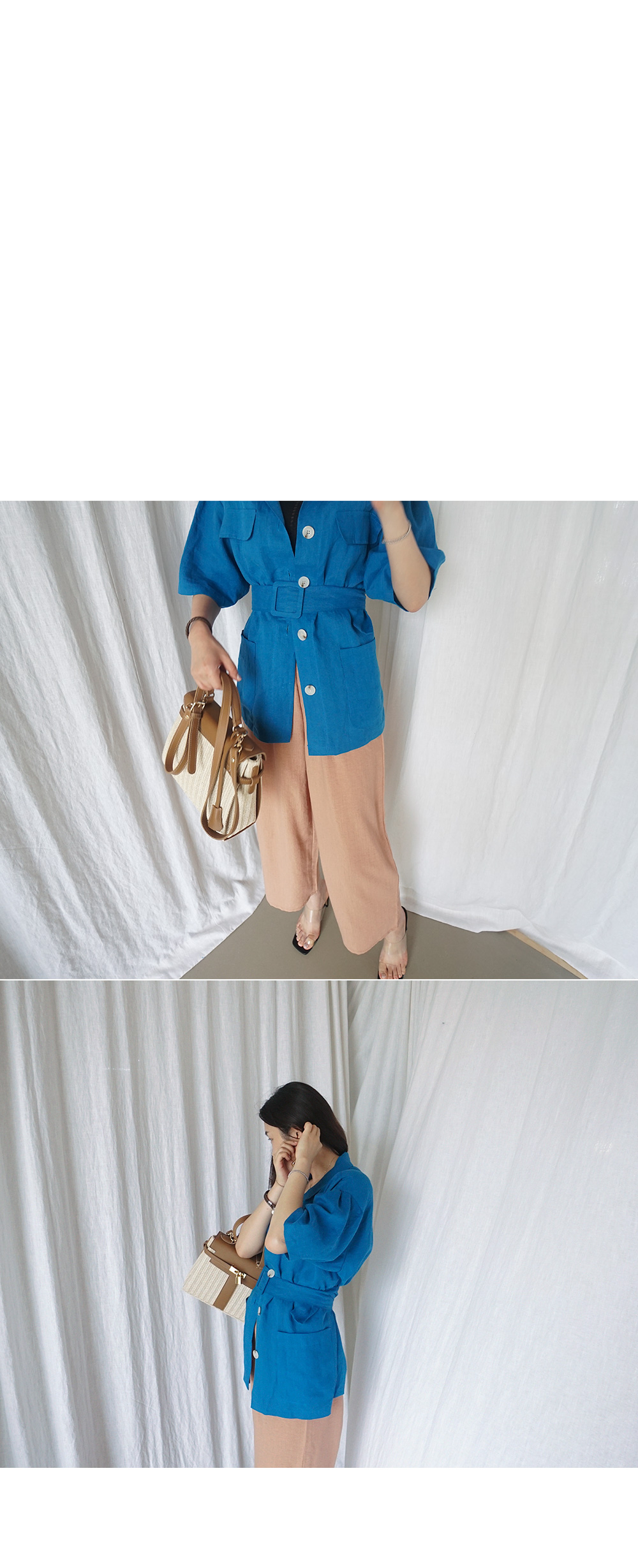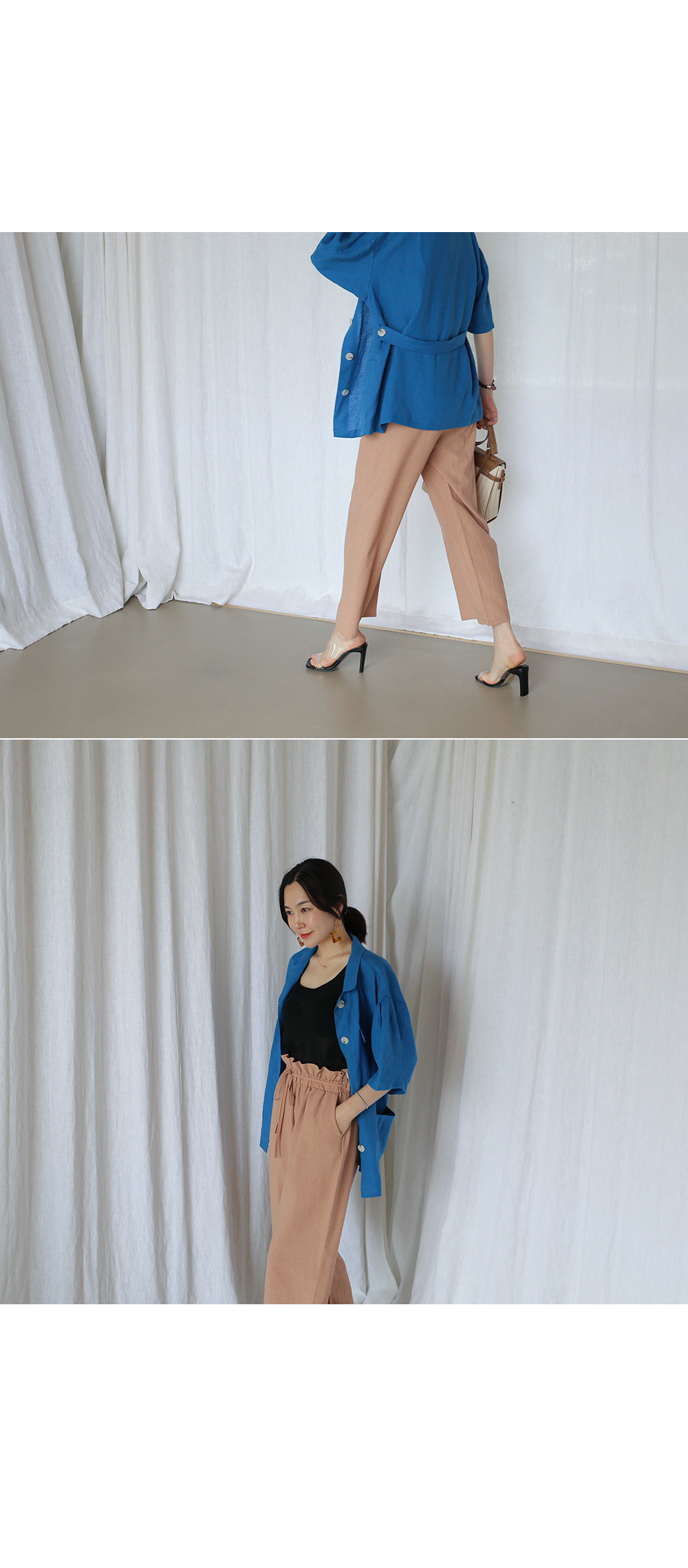 동일한 패브릭의 벨트로 허리선 잘록하게 조여 연출도 가능합니다.