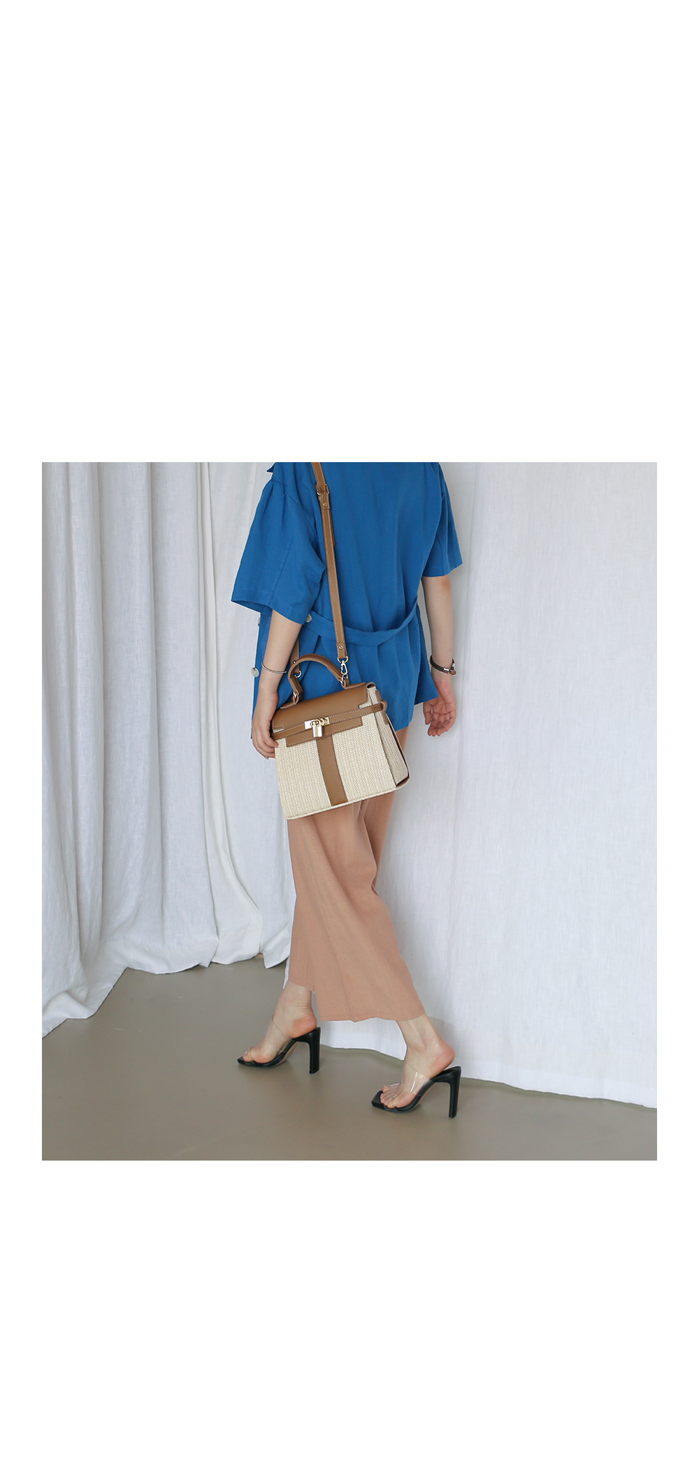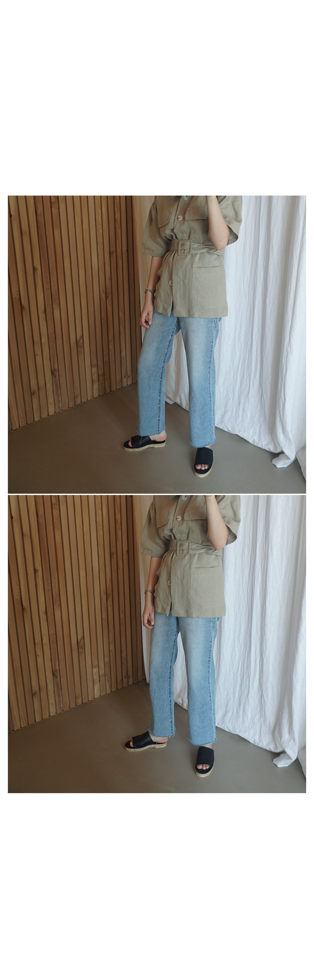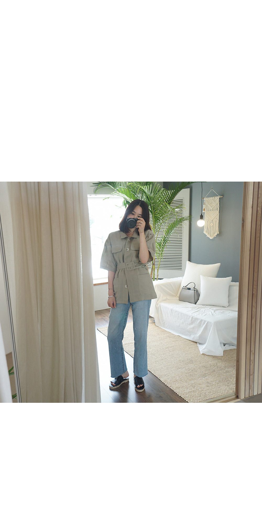 동일한 패브릭의 벨트로 허리선 잘록하게 조여 연출도 가능합니다.