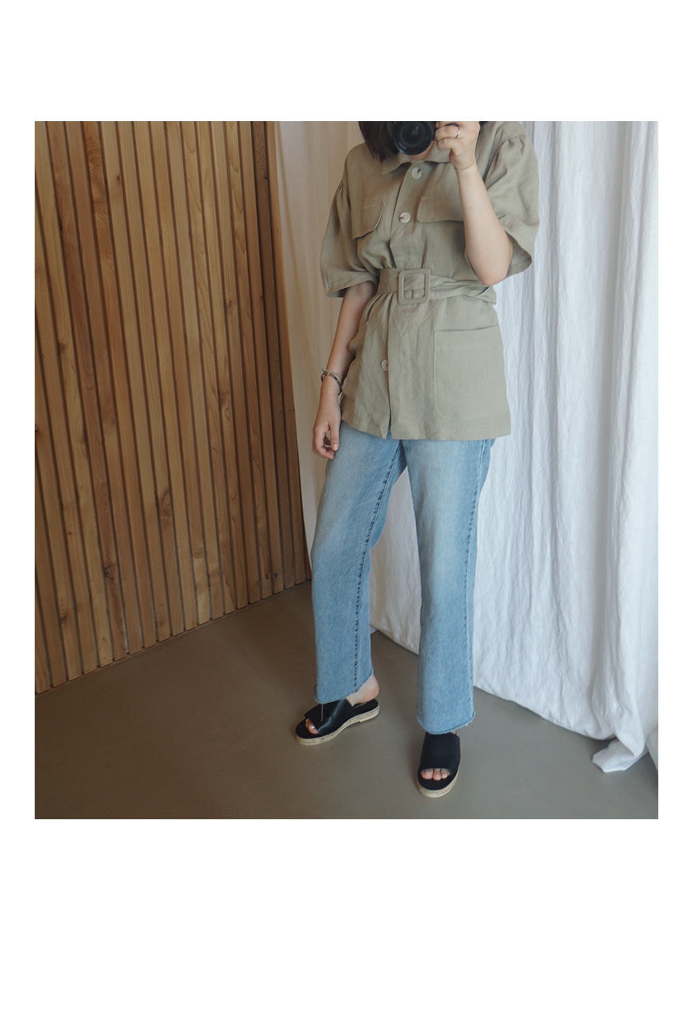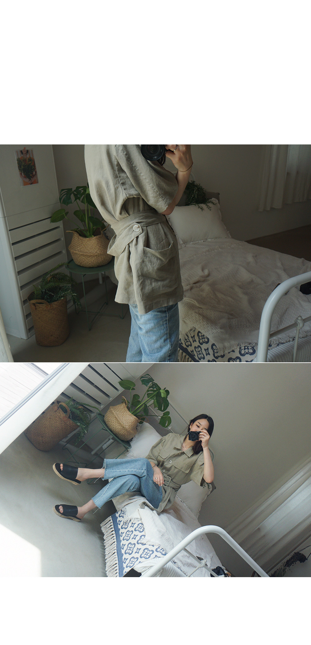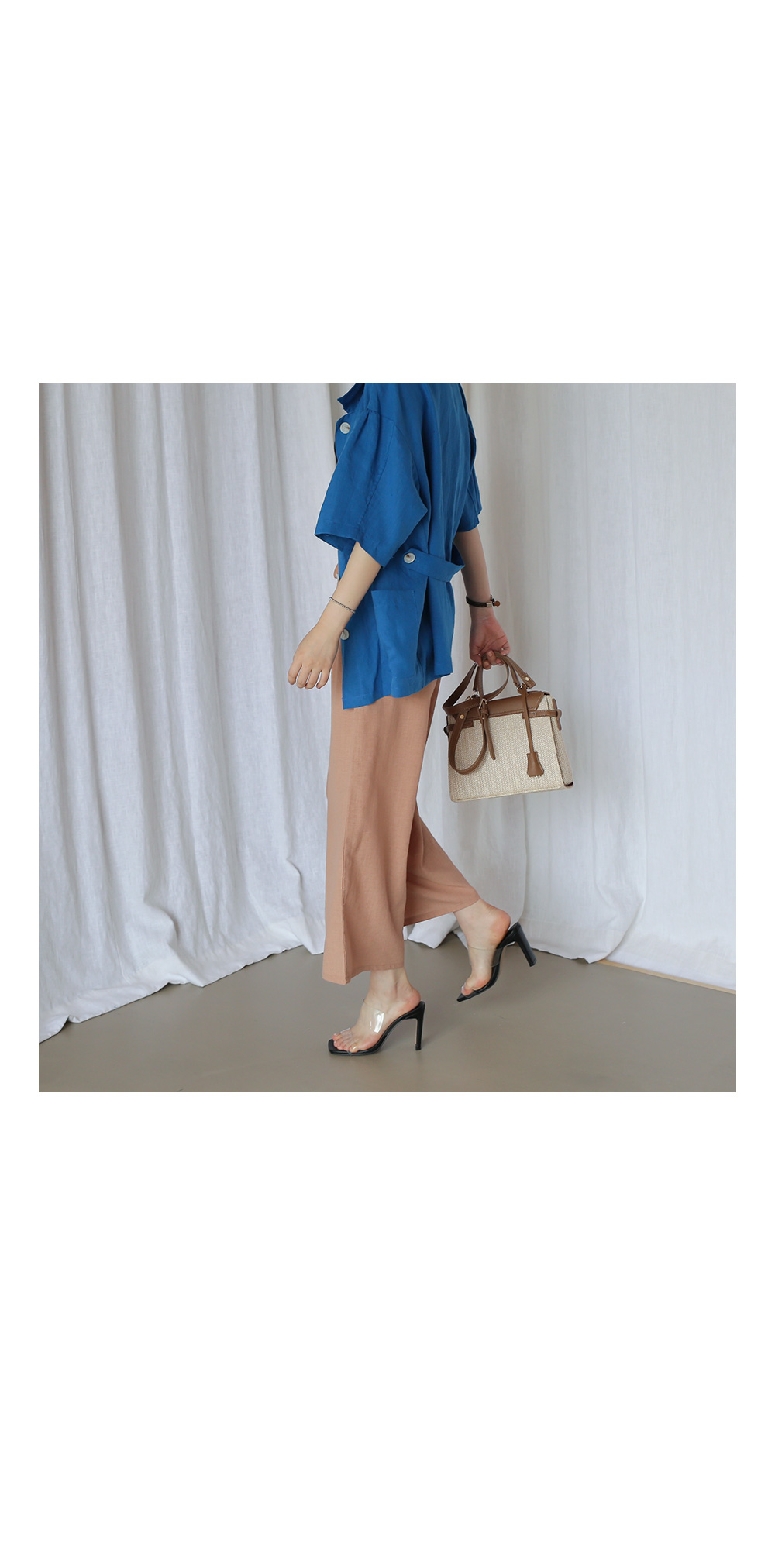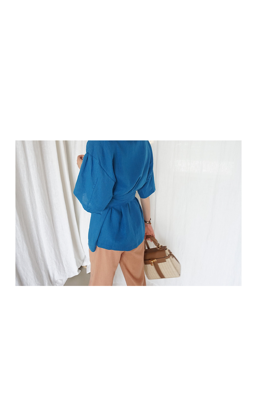 동일한 패브릭의 벨트로 허리선 잘록하게 조여 연출도 가능합니다.
