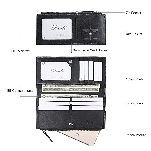 Details ?Top Grain Cowhide Leather ?Black/Gold ?3.74"(H)x7.48"(W)x0.59"(D) ?0.12KG ?14 Card Slots ?1 Zip Pocket ?2 SIM Pockets ?2 ID Windows ?3 Bill Compartments ?1 Phone Pocket