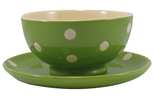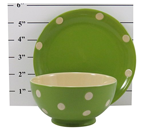 -. Brand : Daiso -. Color : Green -. EAN : 0697111825723 -. Feature : Bundle of two items: one 4 1/2" x 2 1/4" bowl and one 5 3/4" x 3/4" plate, both in neon green with a polka dot design. / This dynamic duo is great tableware for breakfast, lunch, or dinner. Use it for cereal or yogurt in the morning, a small salad or a little soup for lunch, and some dessert with your evening meal. / Made of ceramic, they are microwave- and dishwasher-safe. Add them to your picnic set or even your dinnerware set in the travel trailer. / Anyone receiving this as a gift will love both its cheery design and functionality. -. PackageQuantity : 2 -. ProductGroup : Kitchen -. ProductTypeName : KITCHEN -. Title : Soup Dessert Bowl 4 1/2 x 2 1/4 and Plate Neon Green Polka Dots (Set of 2) -. UPC : 697111825723