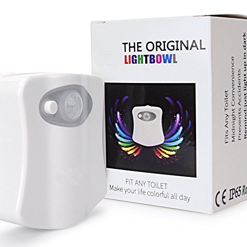 Don't Worry, Pee Happy! Motion-activated night light for your toilet. It fits on the rim of any toilet & turns itself on & illuminates the inner bowl any time you walk into the bathroom at night. No more blinding midnight lights; stumbling around in the dark; falling in the toilet; or aiming in the dark and making a mess! Finally!