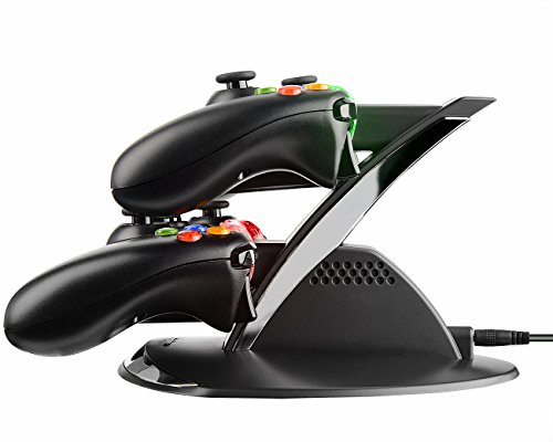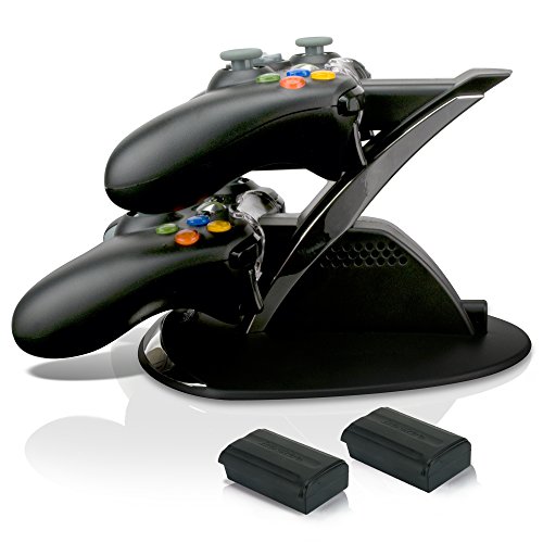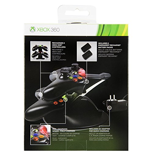 -. Feature : Designed to work with Xbox 360 controllers / Recharges 2 Xbox 360 controllers / Includes charging base and 2 rechargeable batteries / AC Power Adapter features an LED indicator for charge status
