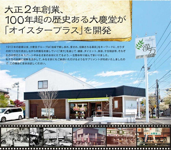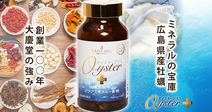 オイスタープラスは漢方の薬剤師が考えたサプリメントです。 近年、日本の「食」は欧米化が進み同時に食事や環境の利便性も向上してきました。その反面、知らないうちにミネラルが不足がちになってしまった現代人も多いのです。五大栄養素の1つであるミネラルが足りていないと疲れやすく様々な心とカラダの変化が起こってしまうことがあります。 私たち大慶堂は健康のプロとして創業百余年の中で培った経験をもとに、皆様の健康をサポートをさせていただきます。人間のカラダは自然界にある自然のものを補うと本来の力を発揮することができます。これらの思いで作ったオイスタープラスは「牡蠣肉エキス」に和漢「黄精」「クマザサ」をプラスしたプレミアムサプリメントです。海のミルクと呼ばれる牡蠣はミネラルの宝庫。必須ミネラル亜鉛の含有量はトップクラスです。他にもビタミン類、アミノ酸、タウリン、グリコーゲンなど栄養素がバランスよく含まれています。大慶堂のオイスタープラスは広島県産の大粒牡蠣を厳選し添加物を極力排除して作りました。また、中国古来の考えに基づき和漢の力を取り入れ黄精と熊笹も配合しました。健康維持の為に!毎日お客様と向き合っている健康のプロが作った「牡蠣」+「黄精」+「熊笹」のオイスタープラスをぜひお試しください。【名称】牡蠣肉エキス加工食品【原材料名】牡蠣肉エキス末、海藻粉末、ナルコユリ末、クマザサエキス末、結晶セルロース、ステアリン酸カルシウム、二酸化ケイ素、シェラック【内容量】16g(400mg×40粒)【栄養成分表示】3粒(1.2g)当りエネルギー 3.816kcalたんぱく質 0.203g脂質 0.022g炭水化物 0.702g食塩相当量 0.025g【お召し上がり方】1日3~6粒を目安に水またはぬるま湯でお召し上がりください。
