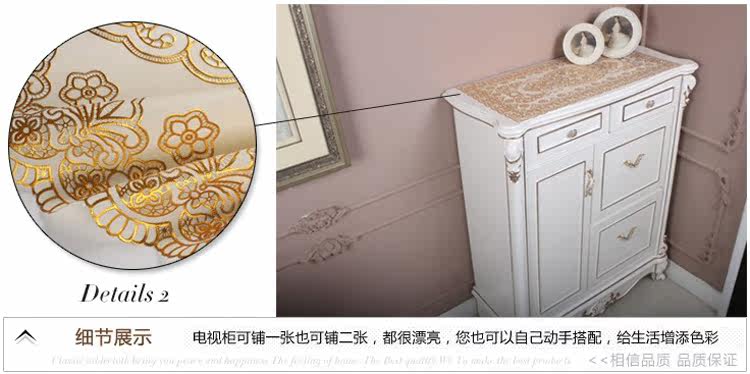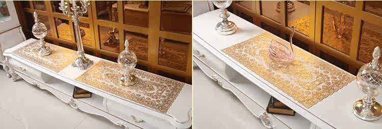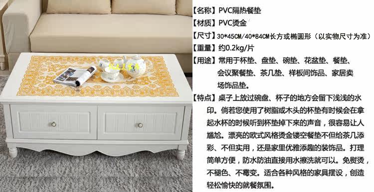 此款产品PVC镂空烫金桌布,防滑耐热、且经久不褪色,高档精美,可替代高贵的不易打理的棉、麻、蕾丝等台布, 可用于餐桌、咖啡桌、茶几上面使用,耐高温、打理方便、只需湿布轻轻一抹就干净,结实耐用,实用性和装饰性极强。