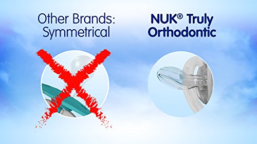 -. Binding : Baby Product -. Brand : NUK -. Feature : Juicy Pacifiers with classic puller and bright pastel colors with no design / Features our improved nipple that soothes and calms baby better than our original nipple and an asymmetrical shape that helps promote healthy oral development by naturally fitting into your baby's palate / Scoop nipple cavity allows maximum tongue movement, which gently exercises your baby's tongue, palate and jaw and promotes proper teeth alignment by helping your baby avoid thumb-sucking / Heart shaped shield fits perfectly under baby's nose for easy breathing and less irritation / BPA free with silicone orthodontic nipple -. Label : NUK -. Manufacturer : NUK -. PackageQuantity : 1 -. ProductGroup : Baby Product -. ProductTypeName : BABY_PRODUCT -. Publisher : NUK -. Studio : NUK -. Title : NUK Baby Talk Puller Pacifier in Assorted Colors and Styles, 0-6 Months