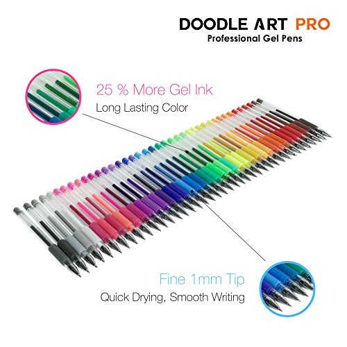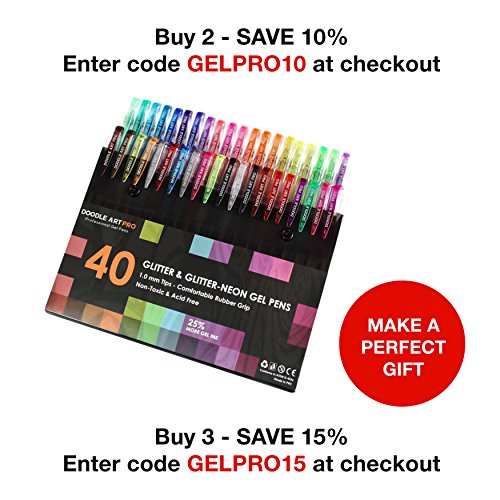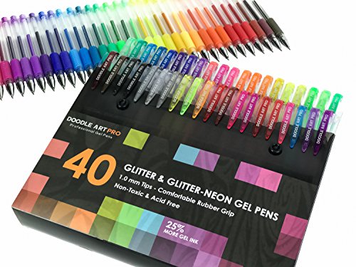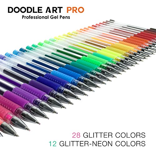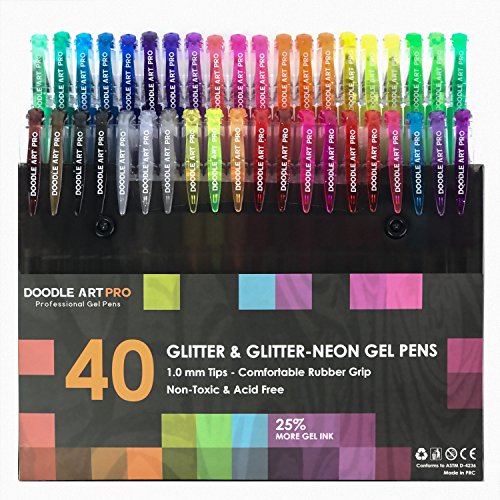 Glitter Gel Pens by Doodle Art Pro - 40 Pack Unique Glitter-Neon & Glitter Colors - 25% More Ink - Professional Gel Pens Set For Adult Coloring Books
