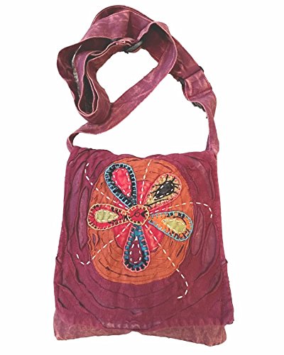 Maroon Handmade Hippie Boho Cross Body Passport Bag with Colorful Hand Sewn Flower