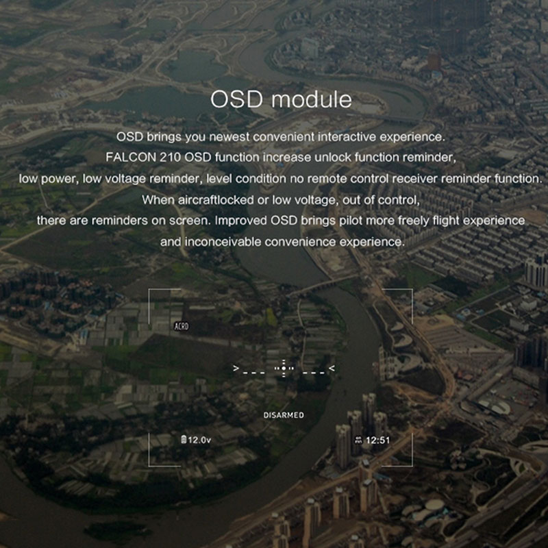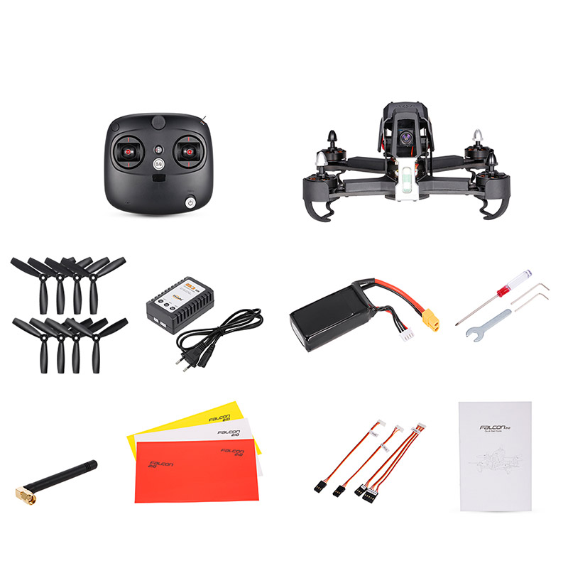 Falcon 210 is a fantastic racing drone with a graceful streamlined appearance and excellent performance, adopts 5.8G real time image transmission technology. Equipped with F3 flight controller, the drone is more suitable for racing. Every motor adopts progressive manufacturing technique, strong power, stable locked provide safety protection for fierce flight. Besides, the OSD module brings you newest convenient interactive experience. Features: The racer body is created using CFP for outstanding crash survivability. Modern industrial and modular design, improves the product performance and permit easy maintenance and upgrades. Advanced 5.8GHz live video and OSD system, for an unforgettable visual FPV experience. The Falcon 210 employs a modern flight control system for acrobatic flight routines such as roll, flip and race course moves. Falcon 210 features 3 useful flight modes: STABILIZE/INTERMEDIATE/ADVANCED flight modes. Colorful and bright LED light make sure a wonderful flying for you at night.