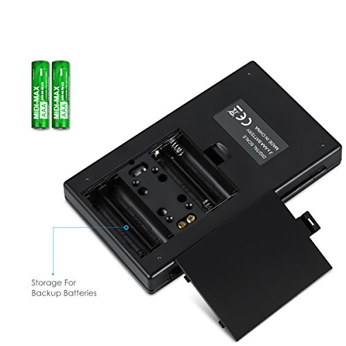 - Intelligent Indication: The cooking scale can alert users for low battery power, overload, and uneven surface placement. Auto-off after 30 seconds of inactivity, which helps to preserve battery power and efficiency; 2 AAA batteries included.