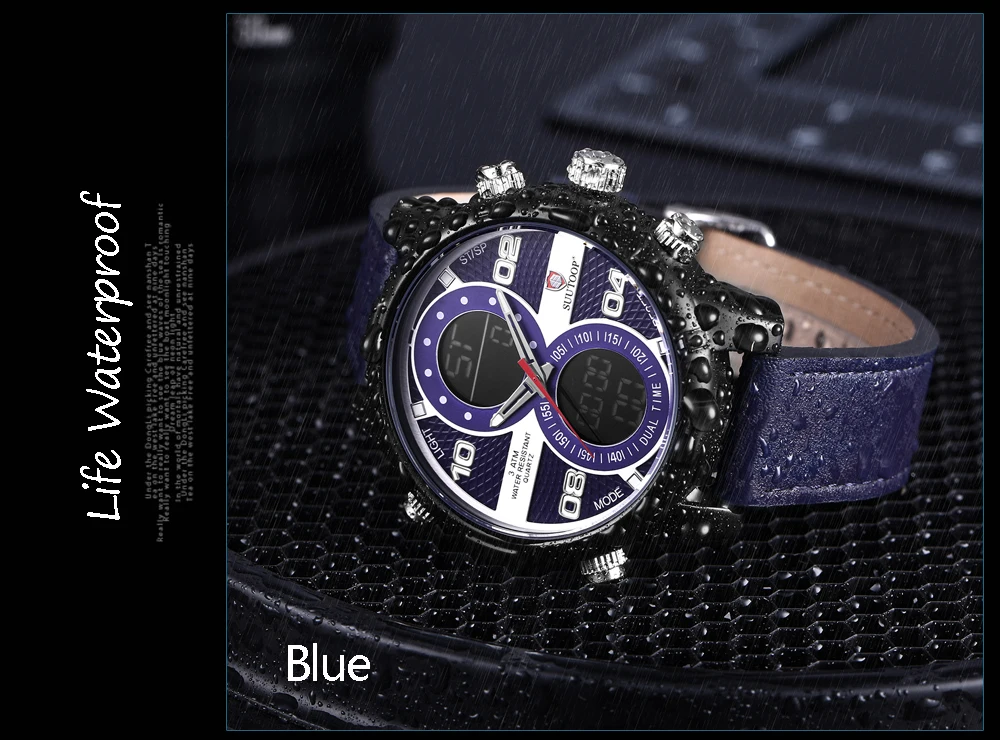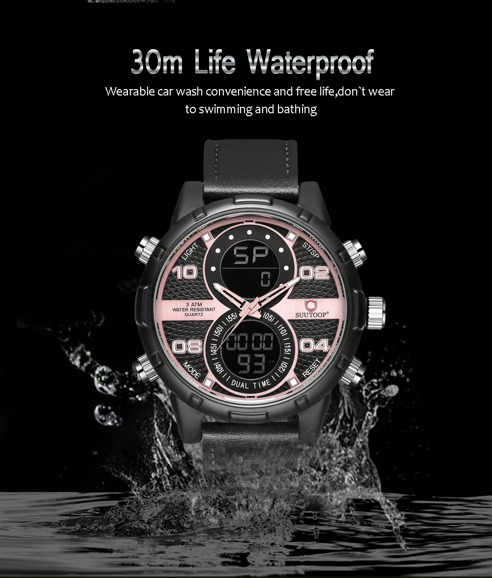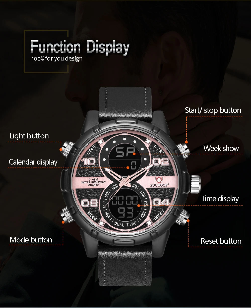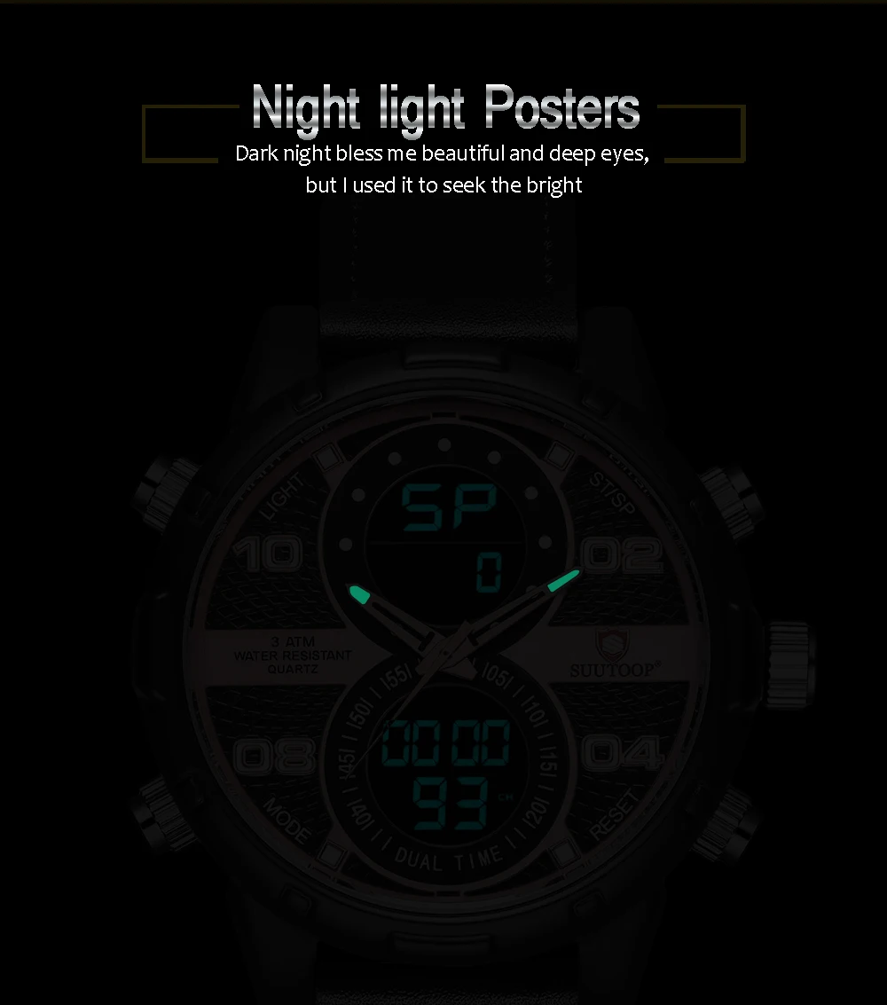 Feature:Complete Calendar,Shock Resistant,Week Display,Water Resistant,Stop Watch,Back Light,LED display,Alarm
