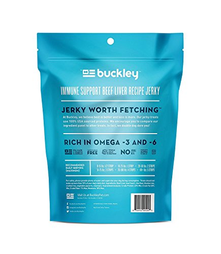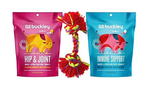 -. Binding : Misc. -. Brand : Buckley -. EAN : 0645038729211 -. Feature : All Natural; Grain Free / Made in the USA; Limited Ingredients / Can be broken into smaller pieces for all sizes and breeds / NO Corn, NO Wheat, NO Soy; NO Fillers; NO added salt or sugar / Colorful 8" Double Knot Rope Toy (colors vary) with floss ends for help cleaning teeth adds fun play time for puppy -. Label : Buckley -. Manufacturer : Buckley -. PackageQuantity : 2 -. ProductGroup : Pet Products -. ProductTypeName : PET_SUPPLIES -. Publisher : Buckley -. Studio : Buckley -. Title : Buckley Grain Free Anti-Oxidant Functional Dog Treats 2 Flavor Variety Plus Toy Bundle, (1) each: Immunity Beef Liver Jerky and Hip & Joint Beef Liver Jerky (5 ounces) -. UPC : 645038729211