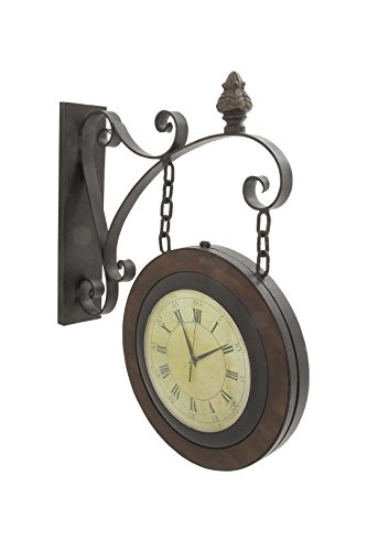 -. Binding : Kitchen -. Brand : Aspire -. Feature : Made of heavy metal frame / Finished in tones of dark brown / Features 2 sided Roman numeral clock face / Requires two AA batteries (not included) / Dimensions: 22W x 4D x 27H in. -. Label : Aspire Home Accents -. Manufacturer : Aspire Home Accents -. MPN : 80433 -. PackageQuantity : 1 -. PartNumber : 80433 -. ProductGroup : Home -. ProductTypeName : HOME -. Publisher : Aspire Home Accents -. Studio : Aspire Home Accents -. Title : Train Station Hanging Wall Clock