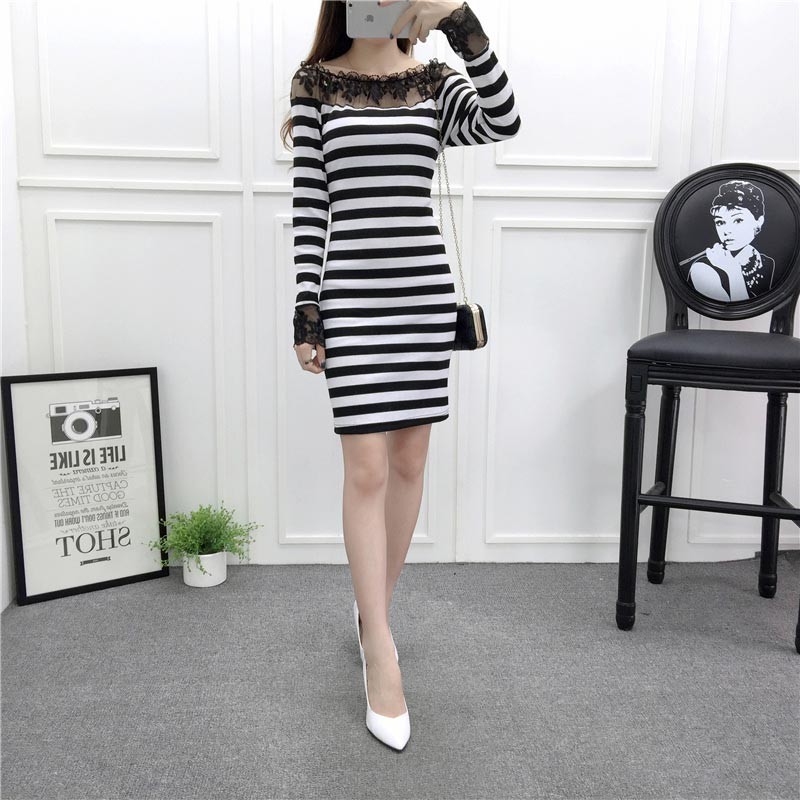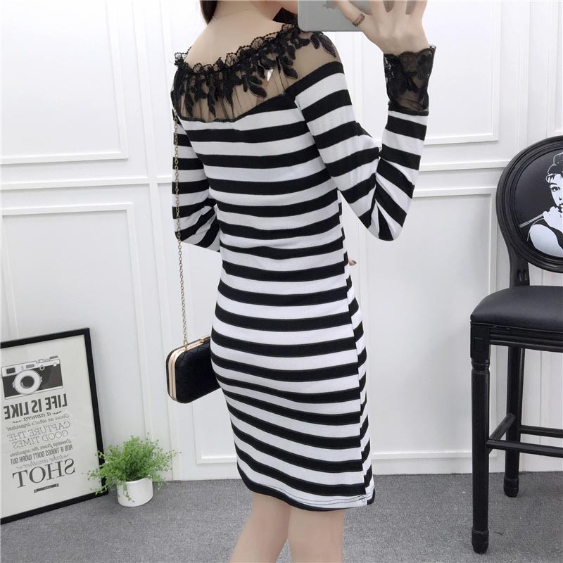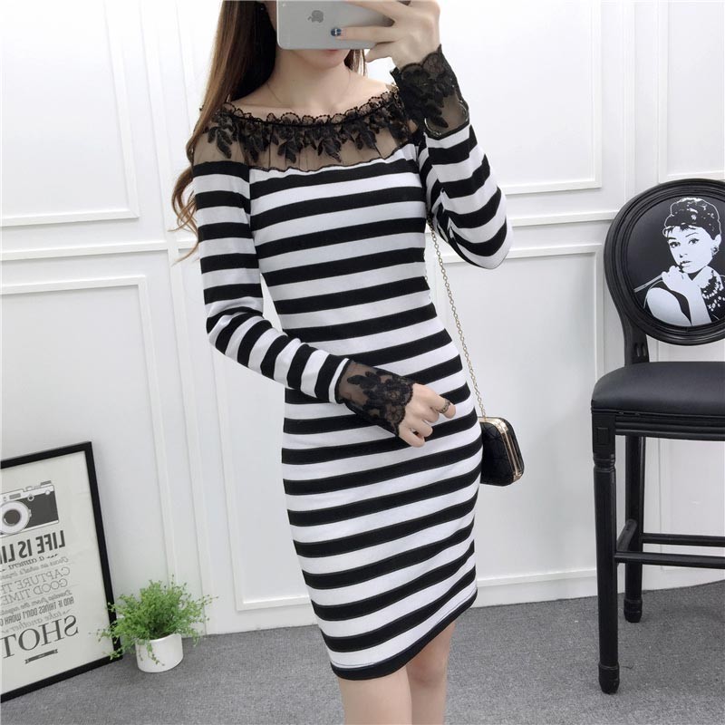 ショルダー&袖口にブラックレース・長袖・ミニ丈のボーダー柄ワンピース♪