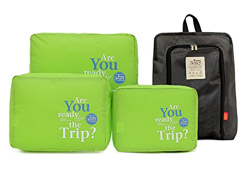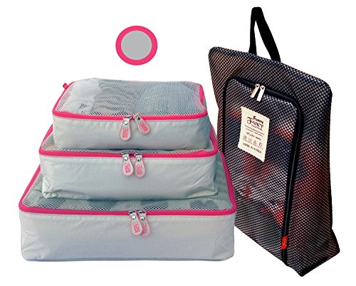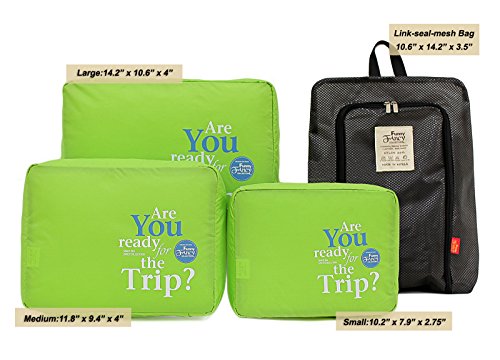 -. Feature : Lightweight best packing cubes; Non-toxic 210D polyester with soft anti-rub see-through micro nylon mesh top; soft and luxurious to touch tough wearing; Water resistant; Link-seal-mesh Shoe bag can be used as Laundry bag or Wet bag; Padded side protection; No nasty smell from this travel cubes / Travel lage suitcase duffel bag backpack organizer meet all packing demands; clothes, toiletries, shoes, laundry, gym gear, water sports gear, electronic accessories; Space saver; Anti-crinkling; TSA friendly gate check travel bag / Luxurious to touch, durable packing cube; Fun 4 colours - Brink Pink, Atlantis Green, Malibu Blue, Bud Gray; Mix and match designer color 2 way opening and easy grip zipper; Suitable for short or long trip, Weekend away, Kids sleep over, business trip, camping, RV and more / Convenient small to medium-large sizes; Small 10.25inch x 8inch x 2.75inch - Med 11.75inch x 9inch x 4inch - Large 14.2inch x 10.6inch x 4inch, Shoe bag 10.6inch x14.2inch x3.5inch (women shoes up to 9.5 size) Remember to check measurements carefully before ordering to ensure you get the correct size for your needs and avoid inconvenient returns or delays / FunnyMade is a registered Trademark from Korea and all products are protected by Copyright; Genuine FunnyMade products are exclusively listed by Cluie, Funnymade's only authorized distributor on Amazon