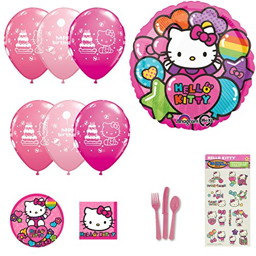 This birthday party or themed party bundle includes the following: 7 inch plates (8), 5 inch beverage napkins (16), 18" mylar balloon un-inflated, 11 inch Hello Kitty balloons, 16 temporary tattoos, and forks, spoons, and knives for 8 guests. All balloons are shipped flat, simply add helium or air.Feature