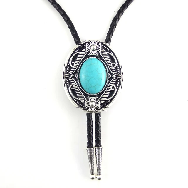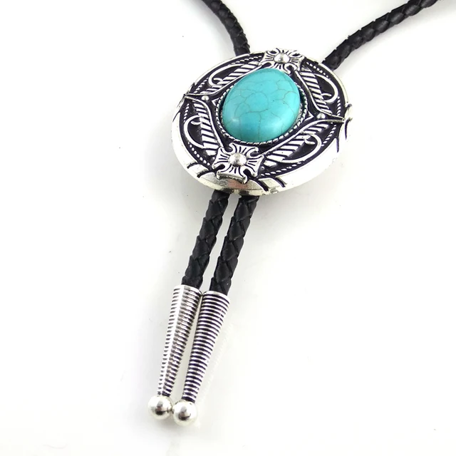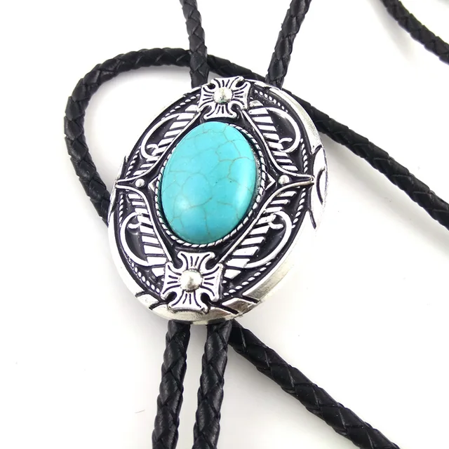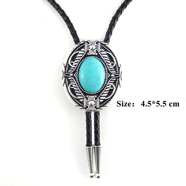 | [해외]블랙 PU 가죽 터키석 볼로 타이 돌 상감 금속 버클 djustable 카우보이 남성 액세서리 패션 목걸이 |