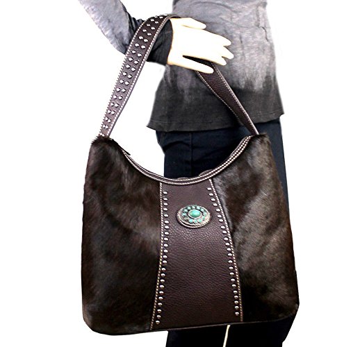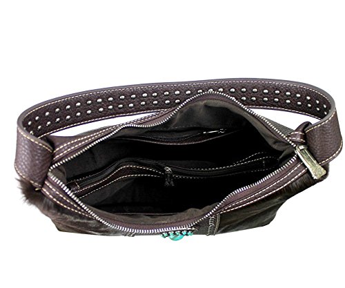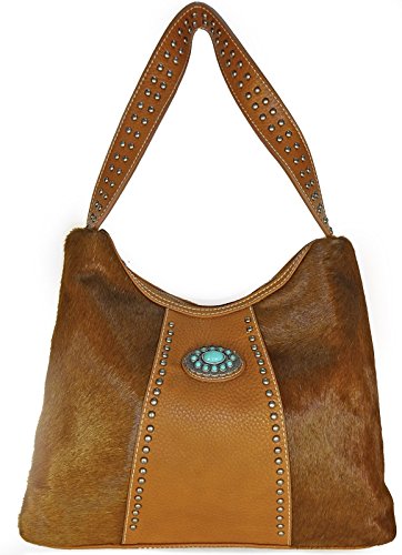 Binding : Apparel Product Description Trinity Ranch® Soft Hair on Hide Leather Front Hobo w/ TQ Accent Product Code: TR17-8284 Bag Measures: Length: 13" Height: 10" Depth: 5" Shoulder Drop: 10" Classic Trinity Ranch by Montana West - Genuine Leather, Soft Hair on Hide in Front - Pu Leather Trim Backing (PU leather: leather particles coated in Polyurethane or a thin layer of leather coated in Polyurethane) - Western Concho w/ Turquoise Beads - Zipper and Pouch Pocket in back - Metal Footed Bottom - Zipper Top Closure - Trinity Ranch Signature Lining - 3 Compartments including center Zipper compartment -2 Open wall pockets and Zipper Pockets inside - Dust Cover